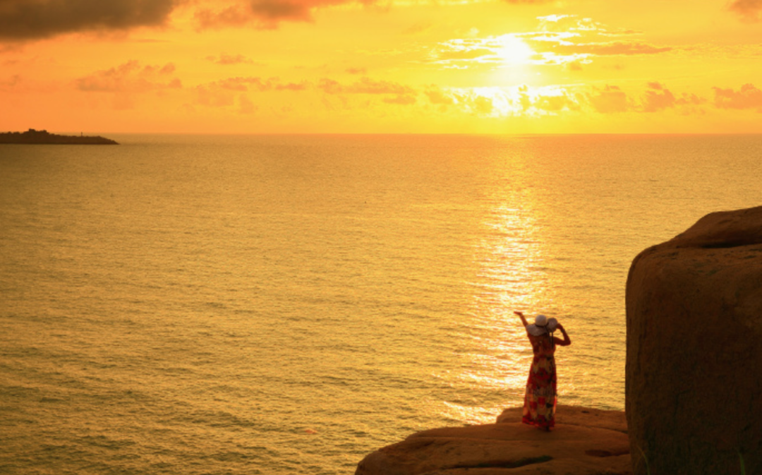 看光芒从海天交接的裂缝中出现,与形状各异的石林、海礁相融,迎接新世界的诞生