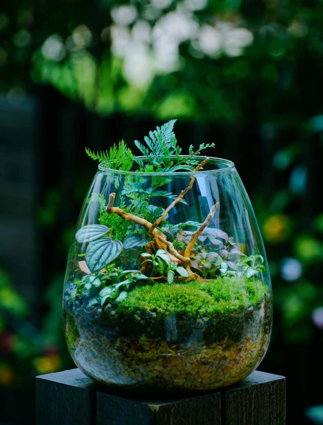 将苔藓、蕨类等植物、加上篱笆、砂石以及各种等饰品装进一个瓶子里,构成妙趣横生的场景。郁郁葱葱的绿,不但可以养眼,可防辐射,吸附悬浮颗粒物,净化空气。