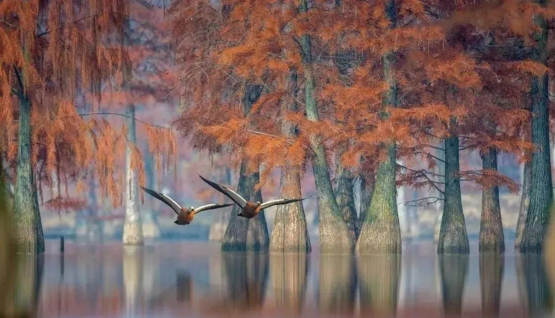 四明湖水杉林名声在外,而绍兴上虞的这处水杉林,却养在深闺人未识。泉水汇成的湖泊,数百数千的候鸟在此栖息, 秋日池杉树影婆娑,美不胜收。